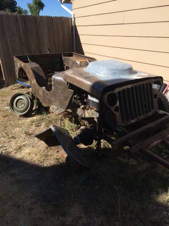 “PROJECT Willys MB with F134 engine and T84 transmission. All pieces included lights, 6 wheels, brand new floor boards, just bolt together and it should be ready to go. It has an upgraded 12 volt conversion. Clear Colorado title with collector plates. It is a project if you can’t weld or work a wrench this project is not for you. ”