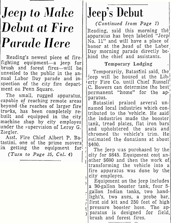 This photo and article was published in the August 29, 1957, issue of the Reading Eagle from Reading, Pennsylvania. It looks to be a CJ-2. It sounds like it has been refurbished into a brush fire-fighting jeep. The article indicates this would be called Jeep No. 11, yet it is labeled Jeep No. 1.