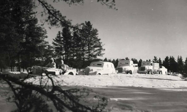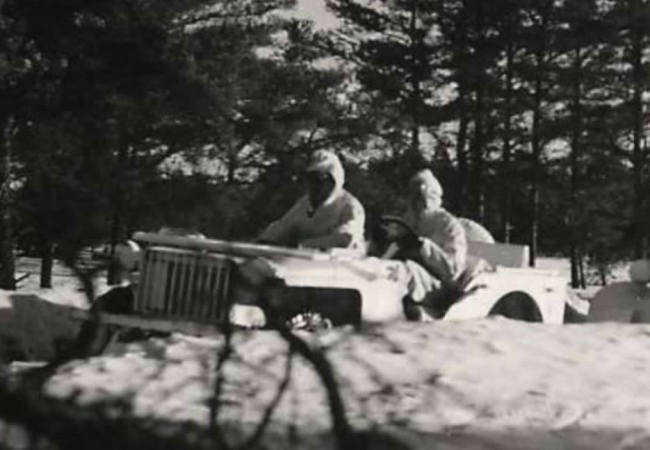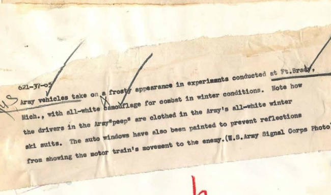 “1942- U.S. Army peep and other vehicles with all-white camouflage during experiments conducted at Fort Brady for combat in winter conditions.”