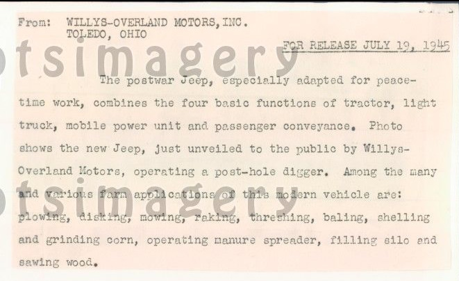 The date on the press release is consistent with the testing that was done at CESOR Farms in July, 1945, so this was no doubt a demo photo done earlier in the year( no leaves on the trees) for the media and VIPS invited to those tests. No rhyme or reason as to why or where they dug that post hole! Those tests used a mixture of MB Jeeps, CJ Jeeps Agri-Jeeps and CJ2A Jeeps, or a combination of them!