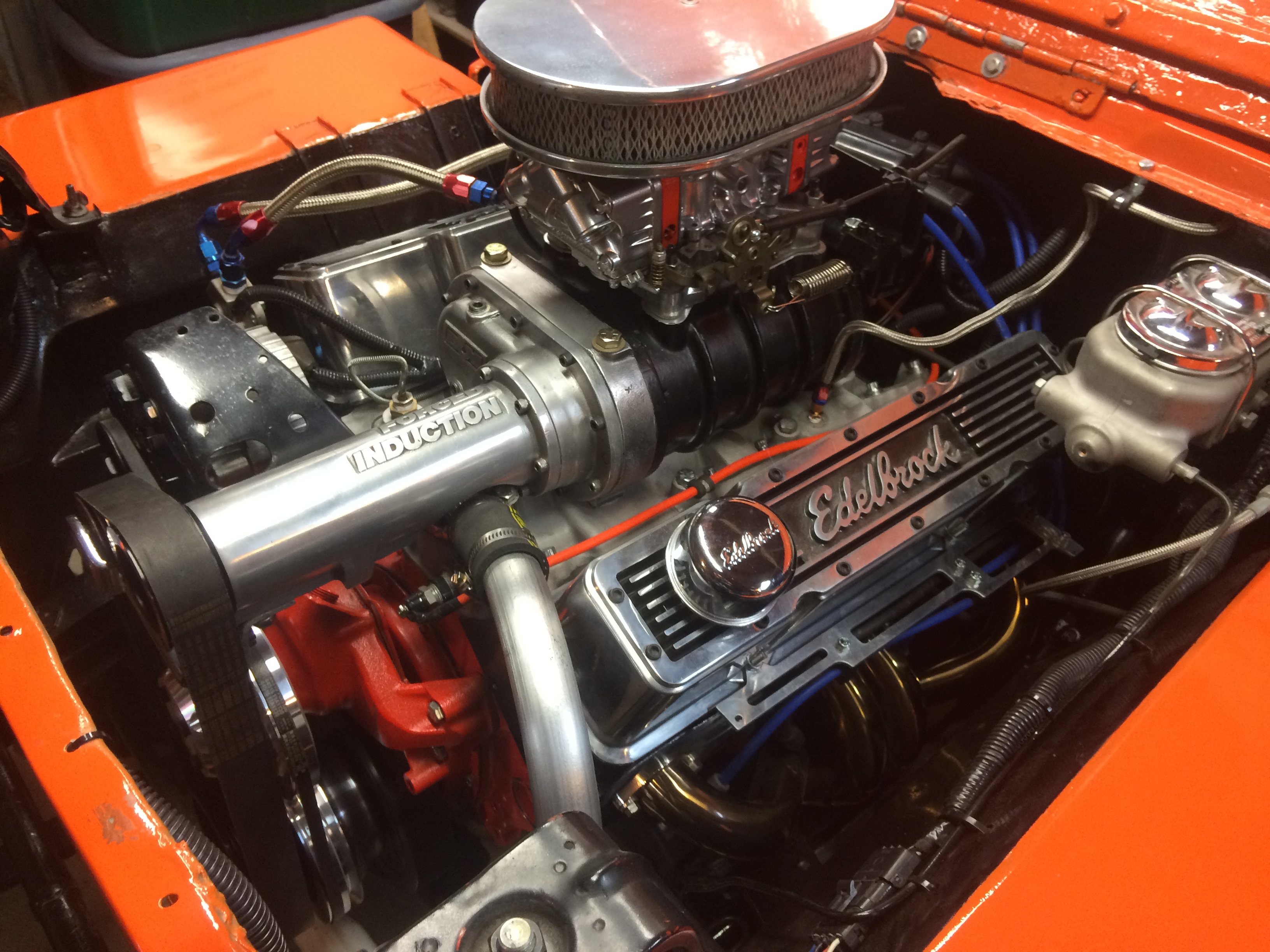 If you do not pay attention it is easy to overlook the Nitrous Sniper kit that it is installed between the fuel cell and radiator. Although the Willys will never experience boost let alone the full throttle that is required to spray nitrous the look you get when you purge the nitrous at a red light has been worth every penny! Now, we can finally talk about the 383 stroker motor! We sent the 4 bolt main 350 block to the machine shop and got it back to install our Eagle rotating assembly. Once the bottom end was together we added Summit Racing 2.02 heads, a Comp Cams blower/nitrous camshaft, a custom carburetor, and new headers.
