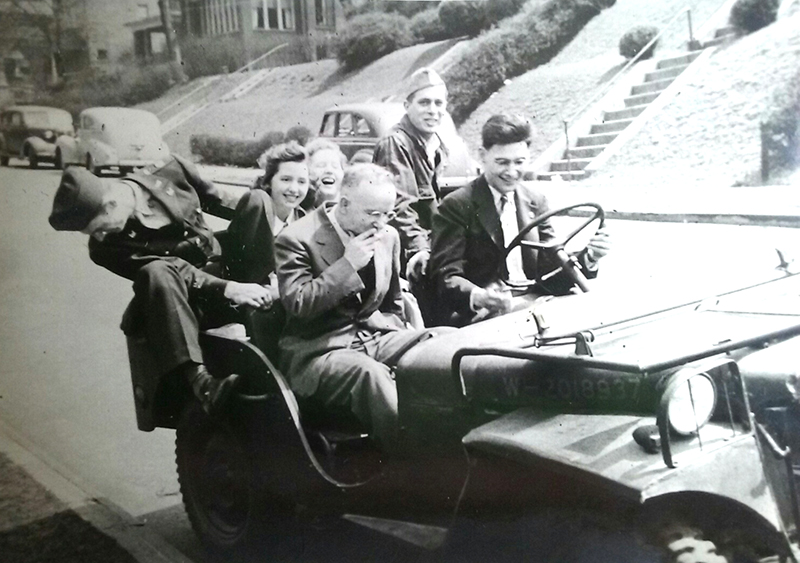 Tim shared this photo. He noted, “The photo was taken on Alderson Street, Pittsburgh, Pennsylvania, outside my mothers and my aunt’s home, with ROTC Cadets From Carnegie Tech (Now Carnegie Mellon). It was her first Jeep ride. My mother is the laughing blonde and the brunette is my aunt.”