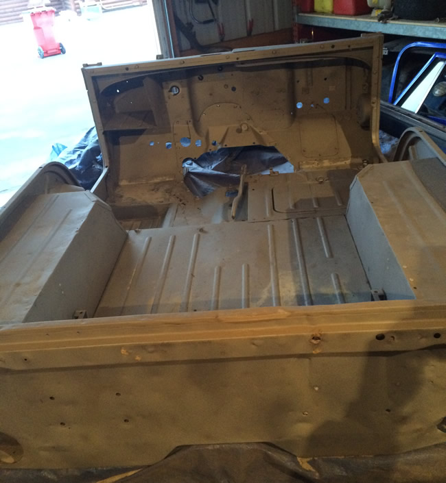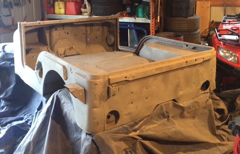 “I have for sale a nice, solid, straight and rust free rolling chassis from a 1955 Jeep M38A-1. Included as part of the chassis are original Dana 44 & 25 axle assemblies with 5.38 gear ratios and open differentials, suspension, some steering linkage and good steel brake lines. The OEM wheels/tires are NOT INCLUDED so arrangements would need to be made. Also included is an original M38A-1 tub which has been media blasted and bare metal, (it is useable but requires repair primarily in the floor area), original T90/Spicer 18 transmission/transfer case assembly, T90/Spicer 20 transmission/transfer case assembly with SB Chevy transmission adapter, OEM M38A-1 driveshafts, nice early CJ-5 hood and grill.”