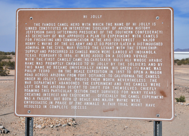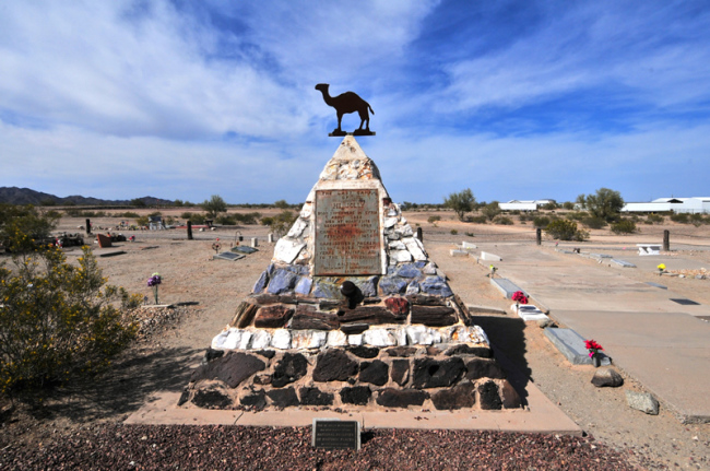 The town of Quartzite has embraced the camel as a mascot, along with a deceased camel driver named Hi Jolly (actually Haiji Ali). Hi Jolly was a Syrian camel expert who accompanied camels brought over by Jefferson Davis before the Civil War as a test to see how the animals would fare in the southwest. After the test was deemed a failure, though there’s some debate they actually failed, Hi Jolly landed in Quartize. The citizens grew fond of him and the camels. Eventually, the camels were released into the wilds, last seen in 1947. Meanwhile Hi Jolly, who’d been born in 1828, died in 1902. A monument was erected by the citizens of Quartzite to their beloved friend.