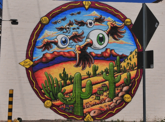 Next, we headed south for the town of Ajo. We learned speed limits don’t apply on this remote highway. We thought it best to keep up with the traffic (I won’t mentioned the excessive speeds). Eventually, we arrived in the town of Ajo. As we entered it we encountered this bizarre mural.