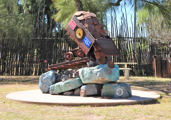 Finally, as we were leaving a town near Hayden called Winkleman, we spotted this unusual sculpture showing copper coins falling from an ore care. As we learned yesterday, it’s not so easy to turn copper ore into copper coins.