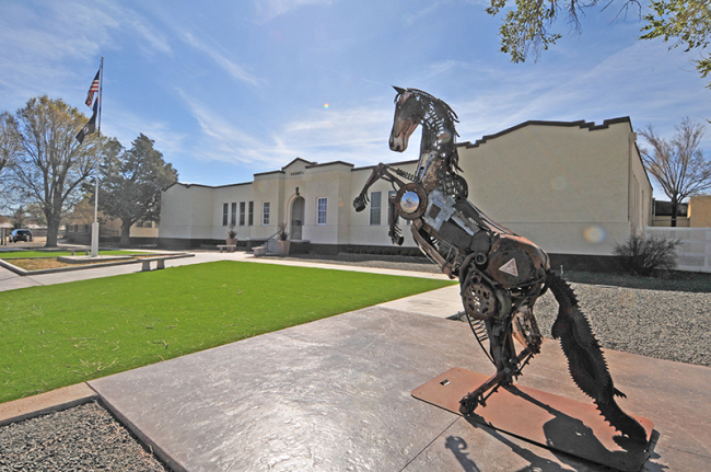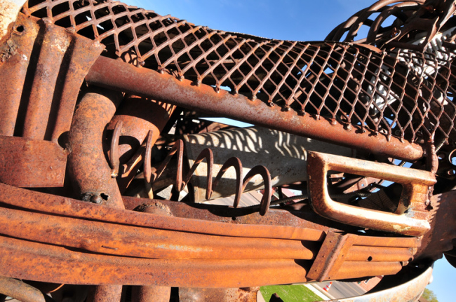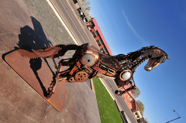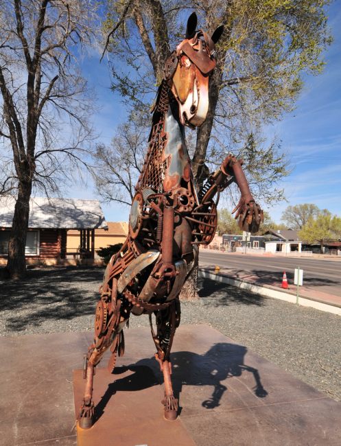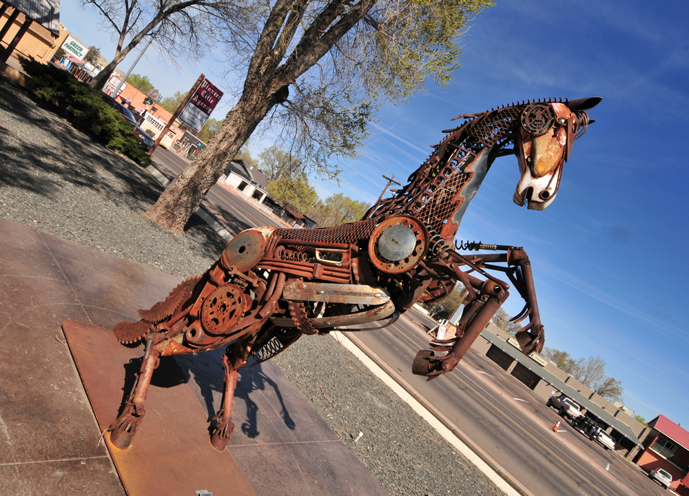 Back on the highway, it wasn’t long before we climbed out of the canyon, drove through the town of Show Low, which sits at 7000ft. Passing through there, we soon found ourselves on the the high plains of northern eastern Arizona. It’s another place where speed limits are a rough guide. As we neared the border town of Eager, we passed by this unique car-part sculpture at the local museum.