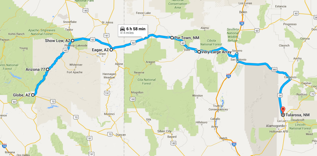Today we drove from Globe, Arizona, to Tularosa, w Mexico (see yesterday’s post here). We woke up early, aware we had a long drive ahead of us. We headed north out of Globe via Highway 60. We said goodbye to the Suhuaro and prickly pear cactus as we climbed rapidly into the mountains.