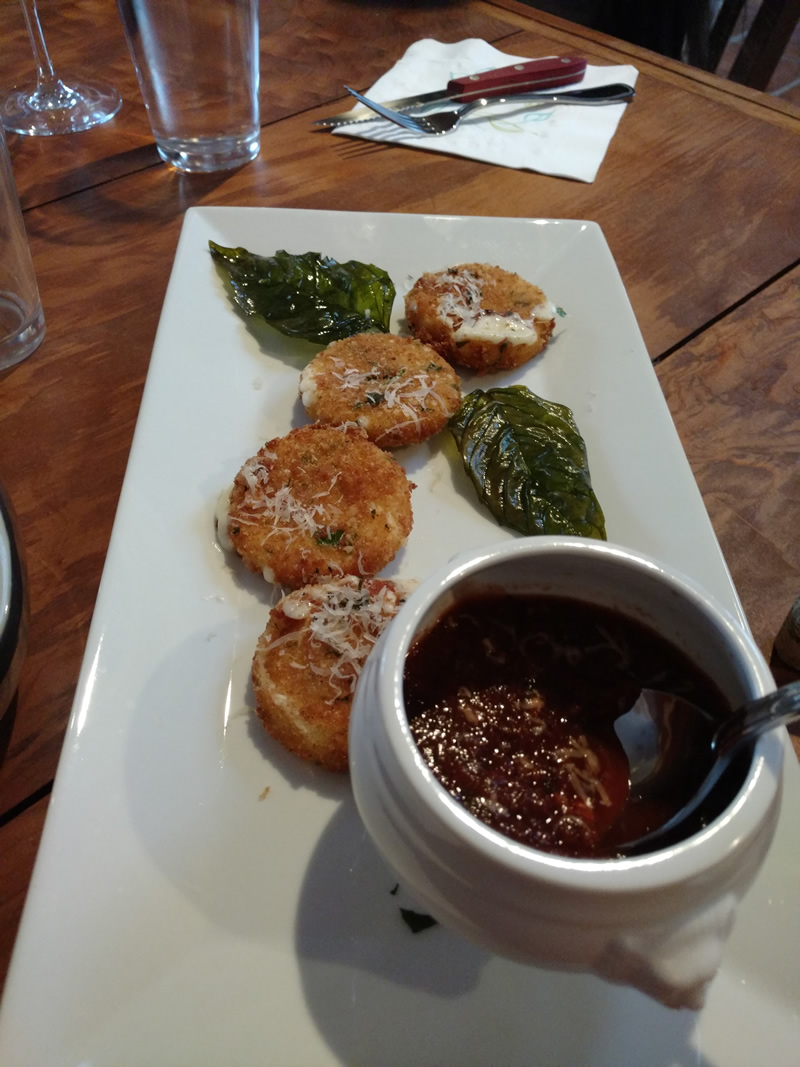 The first item on the menu was a cool take on mozzeralla sticks. They were small wheels instead of sticks, with a light, tastey breading. Even better, they came with a tomato pomodora sauce that was both tomatoey and spicey. Yum!