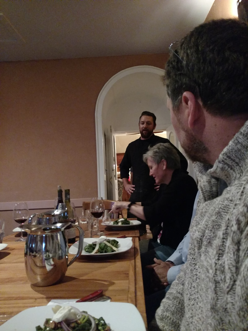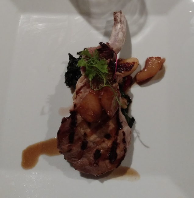 Finally, the main course was a French take on the pork chops I’d had the night early at Casa De Suenos. They, too, were juicy and tasty. Ann has requested that I figure out how to make them, so the chef gave me some pointers.
