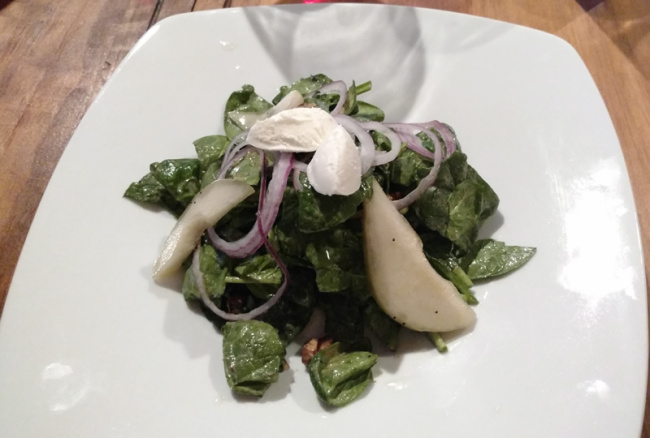 Next we had a delightful spinach salad with pecans, goat chess, and red onions, gently bathed in a pinot grigio reduction. Fantastic!