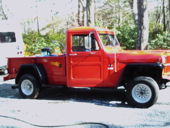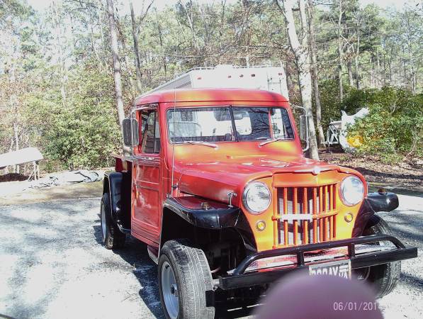 “1954 willys one ton pick up truck was done by me about 4 1/2 years ago ,has a 221 v8 out of a 1962 fairlane . truck is done and is drivable street legal. has some blemishes but is fun to drive . the 4wd is still in the truck .guts to the front end have been removed .i have another front end for it and all the parts to put it back 4wd . gears were changed in a newer rear end to make it do 55 down the road”