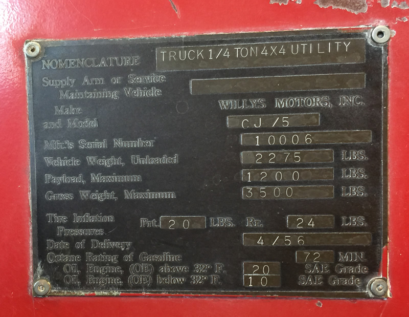 We visited the National Museum of Nuclear Science & History during our trip last year. They had some cool gifts, including a set of shot glasses and wanted to buy. When we walked into the gift shop, look what we found! 1956 CJ-5 (serial number 10006) purchased by the federal government, complete with a data plate. One of the more interesting mods was the RPM gauge on the grille and a custom bump on the hood. When I saw those mods I got very curious about what was under the hood, so I pulled the “I run a large vintage jeep website” card. Of course, they had no clue who I was, but they let me open the hood anyway. It was all stock, except for the mice droppings; someone hadn’t cleaned under the hood in a while. I concluded the gauge and hood were likely not original to the jeep, hence they were painted black.