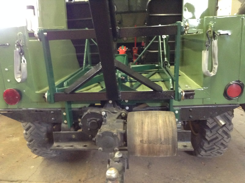 I started the final mounting of the Farm Aid Lift. It is attached to a ’46 CJ2A. The rear unit mounts simply by using the existing bolt holes for the jeep draw bar.