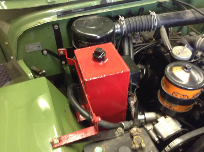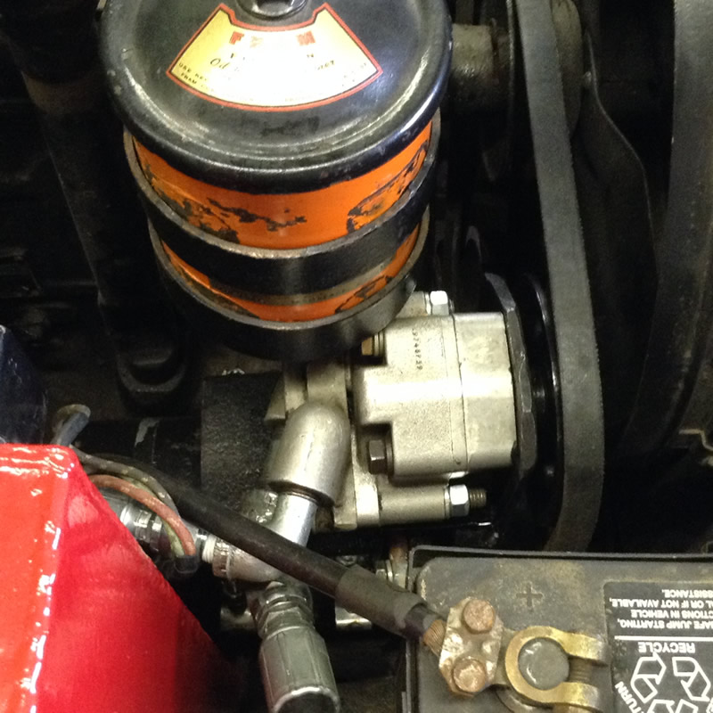 Since the jeep has a Koeing crankshaft driven winch in the front I couldn’t use the crank to drive the hydraulic pump. I fabricated a bracket for the pump and strapped it to the generator. This is similar to the way a Hi-Low pump mounts.