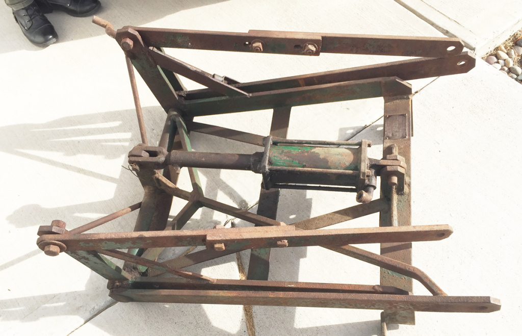 This is a puzzle. The way it lifts to keep the back four points plumb leads me to conclude there is more to this for a universal lift mechanism. I cant see being limited to just one manufacturer’s implements or they wouldnt sell to any farmer. If you think in terms of a quick-tach implement currently used on front-end loaders, think bale forks for example, it would allow the use of this lift for other implements. The six inches or so it lifts as measured at the bed would be magnified at the end of a typical implement. Given this is all flat stock, if you can just find a picture of something on another tractor or another jeep I dont think it would be difficult to duplicate the capability. I like it a lot and look forward to seeing what it can do once the mystery parts are located.