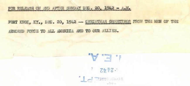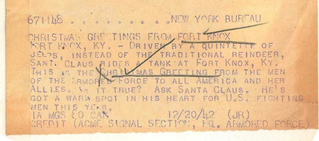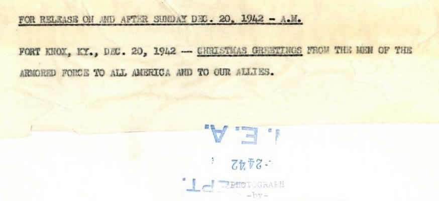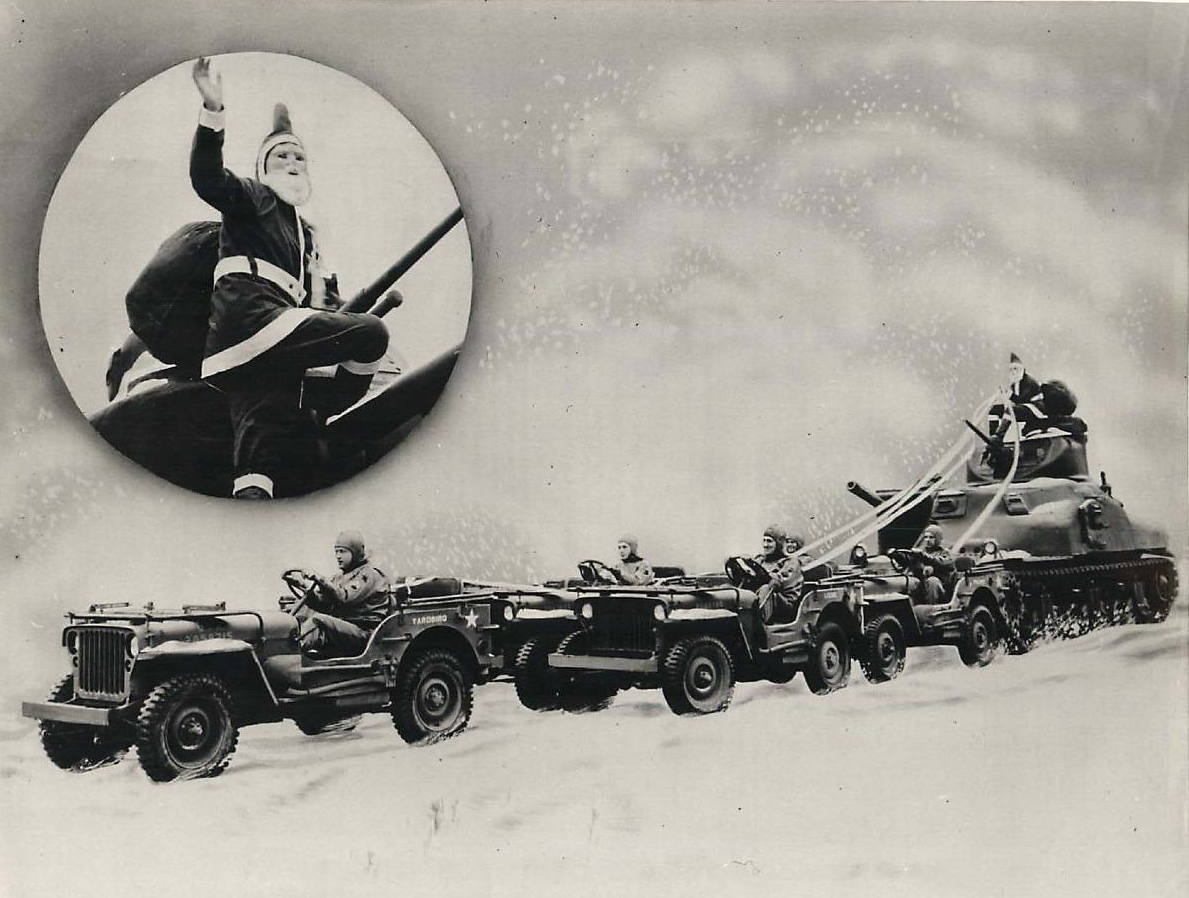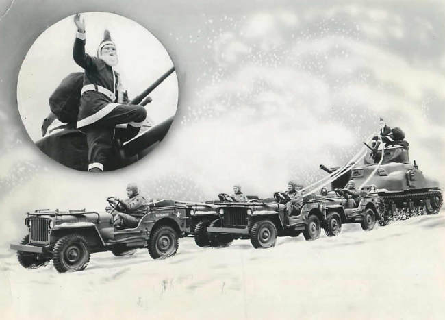 “1942- Pulled by a quintette of jeeps instead of reindeer, Santa Claus rides a tank at Fort Knox. This was the Christmas greeting from the men of the armored force. Name “Yardbird” is painted on lead jeep. The others look to have names as well but I can’t make them out.”