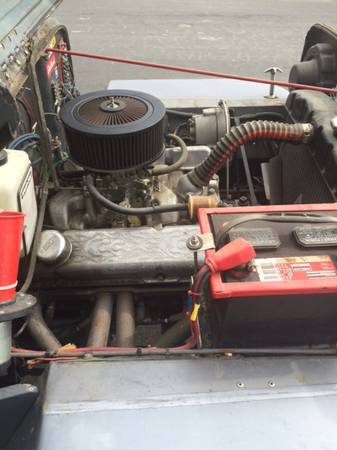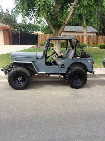 “1954 High hood Jeep Willy’s for sale. Clean, new wheels, new tires, 4-speed with overdrive, small block Chevy. Has a full top and a bikini top.”