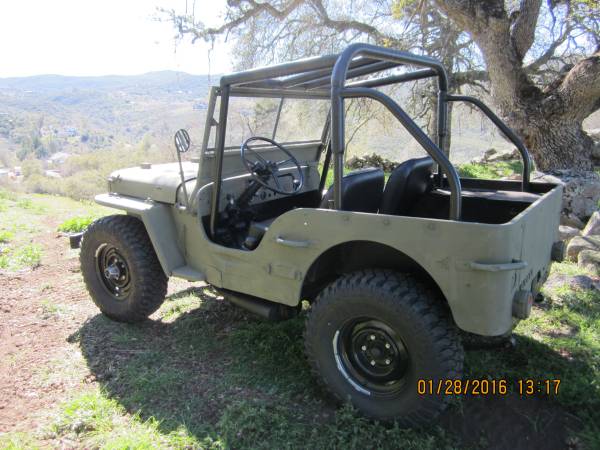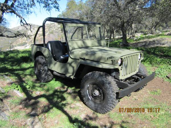 “1942 willys mb complete frame off rebuild. this is a turn key vehicle that is built right and needs zero work. new 231 odd fire v-6, headers, walker exhaust, 65 lb fly wheel, new Rochester carburetor with electric choke, HEI ignition, new starter, alternator, fuel and water pump. new aluminum radiator, gates belts and hoses, new clutch, up graded rebuilt t-90 transmission, rebuilt d-18 transfer case, up graded rebuilt d-44 rear end. 4-27 ratio. up graded d-27 front end with cardan cross axles, bearings and seals.up graded to 10′ brakes with all new shoes, hoses, lines and cylinders. Dual master cylinder, all new bushings, new windshield glass, new seats, completely rewired, OD green #41 paint, reinforced frame, body, hood and bumper. New interstate battery with disconnect. Sealed dual tanks with individual sending units, full roll cage, locking hubs, new Mickey Thompson mtz tires, new seat belts, rebuilt drive shafts, fully undercoated. clear title with pink slip. serious inquiries only. cash, no trades. this is basically a new jeep with zero miles on it since rebuild.”