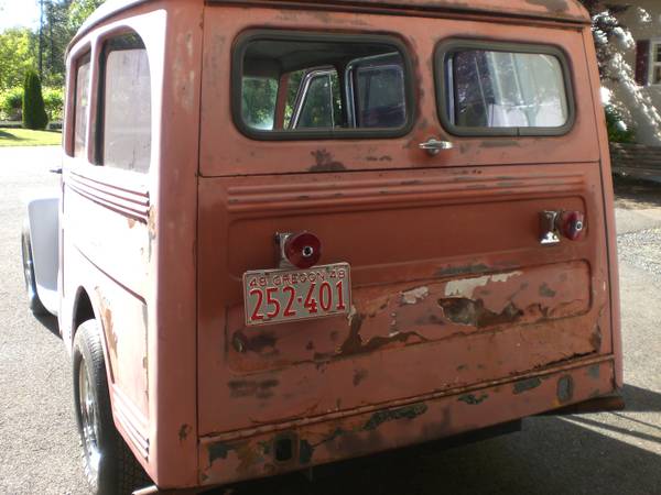 “1948 Willys Wagon Chevy 400 Engine 4 speed trans, runs & drives good, Registered as 48 with 48 plate, crome tail lights, head lights & turn signals Brake lights all work, Bench seat W/ Belts. needs sum body work i have metal pieces for tailgate, ”