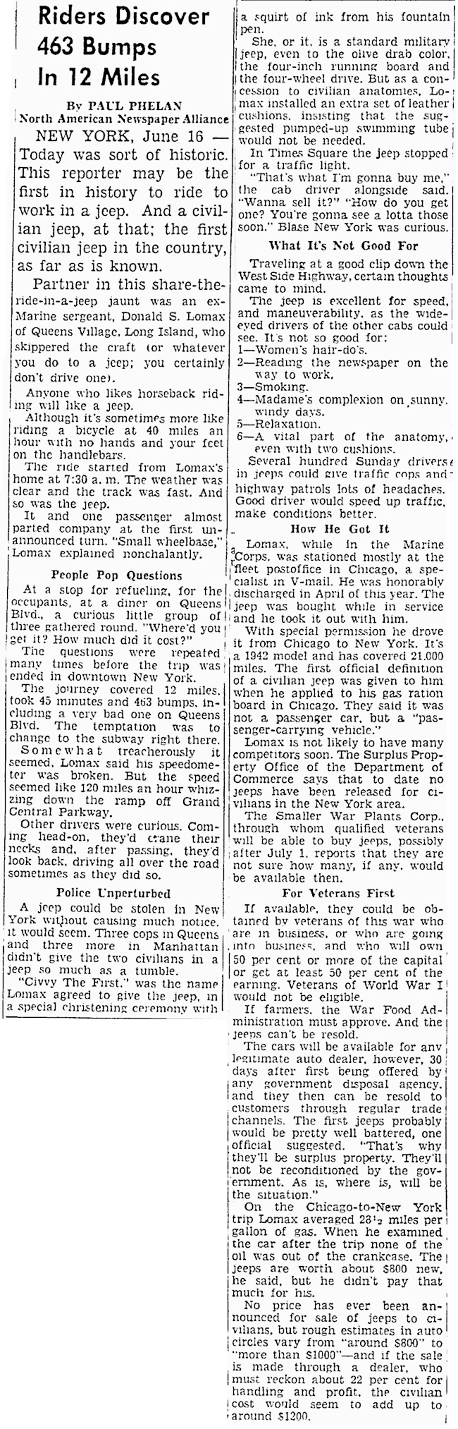 The list of five items that the jeep is not good for is an interesting one. This was published in the June 16, 1945, issue of the Pittsburgh Press.