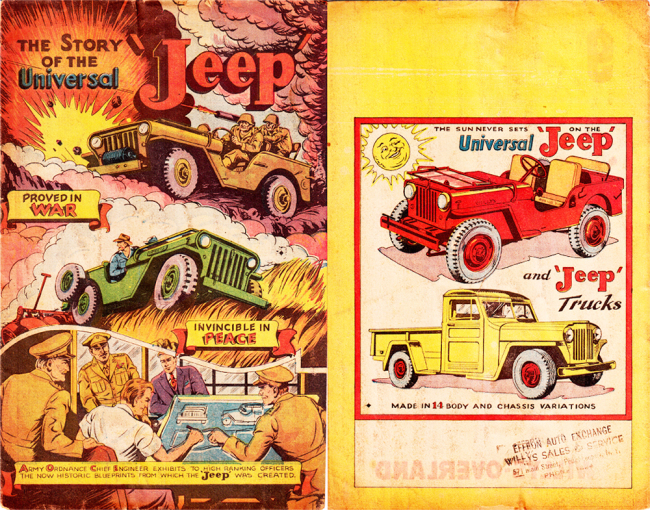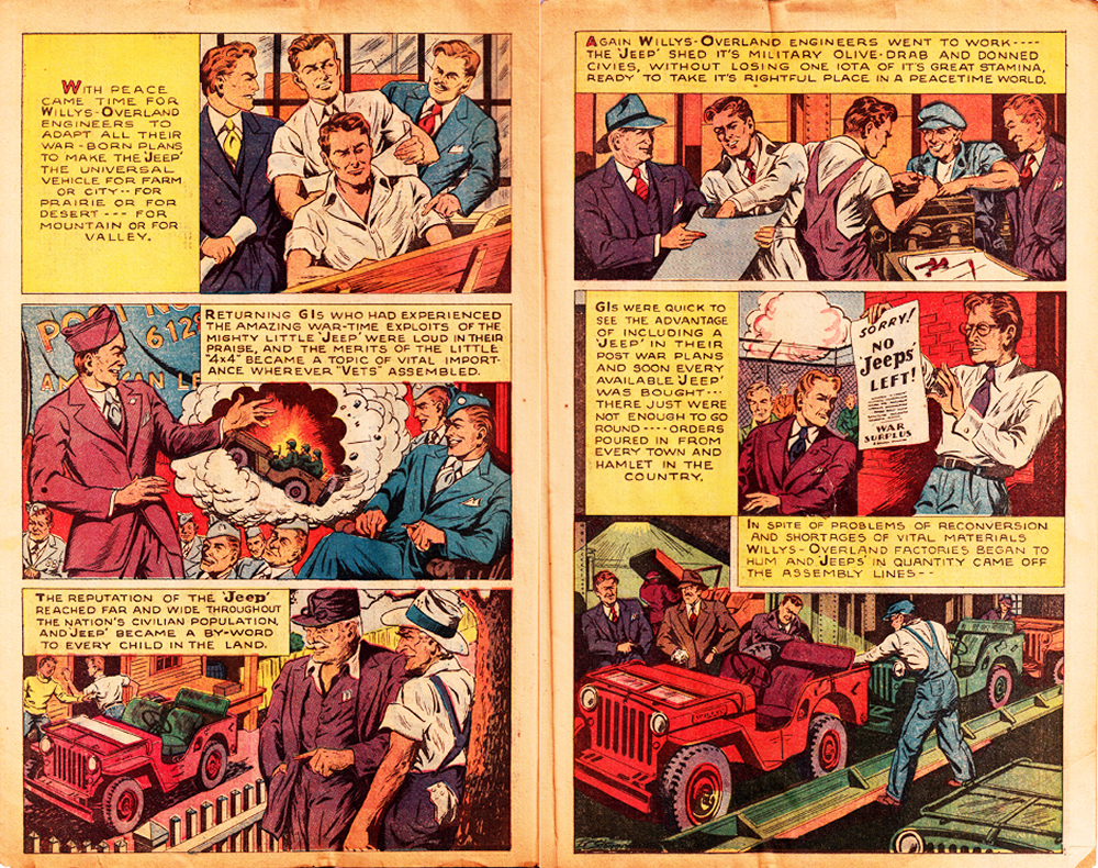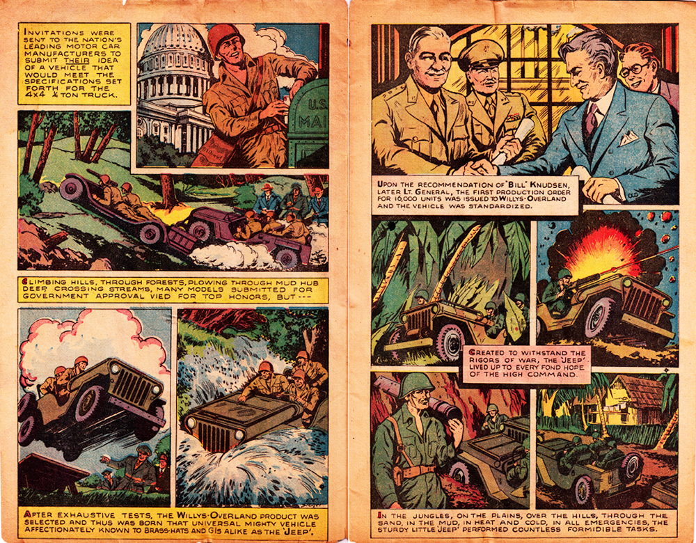 But I find it interesting that they depicted every jeep (war and post-war) with the 7-slot front grill… maybe an early bit of revisionist history? Or it helped tell the continuity story?