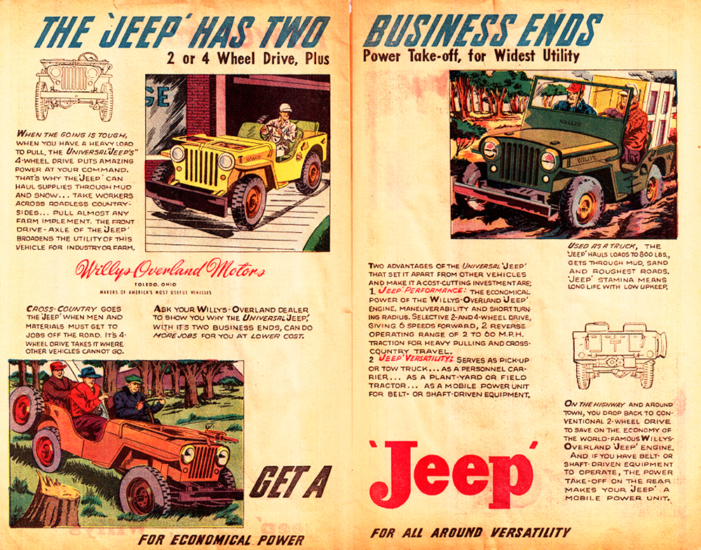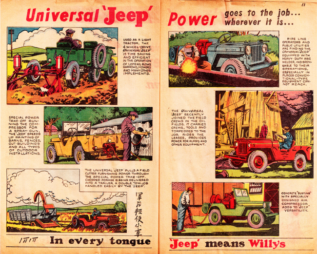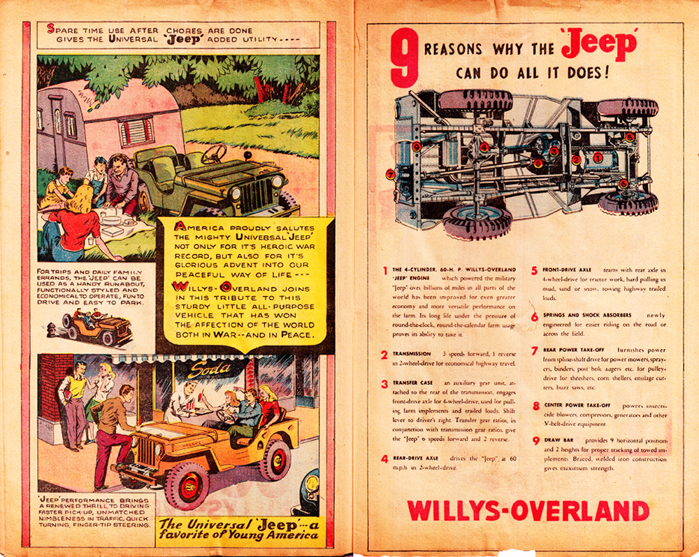 Two things caught my eye. I like the functionality aspect, so I like the PTO powered saw scene. Then there’s that famous Picnic scene with the Jeep towing the camp trailer on page 13. Of course, I just learned here on eWillys that the “family use” marketing scene with the Jeep and trailer was utilized. I did notice that the background in different in the comic strip, than in the photo posted earlier.
