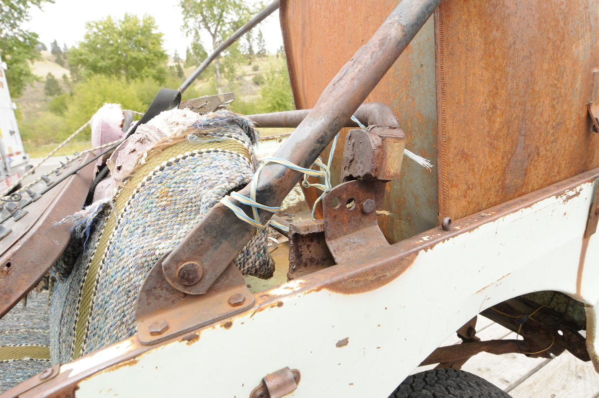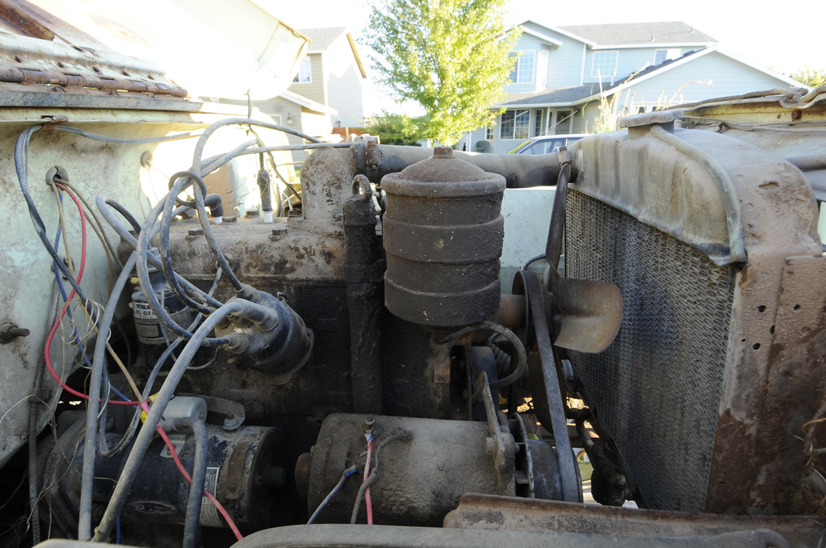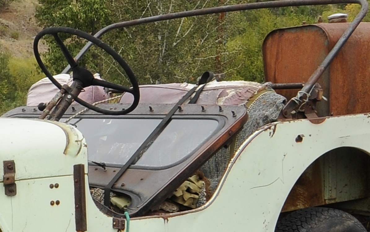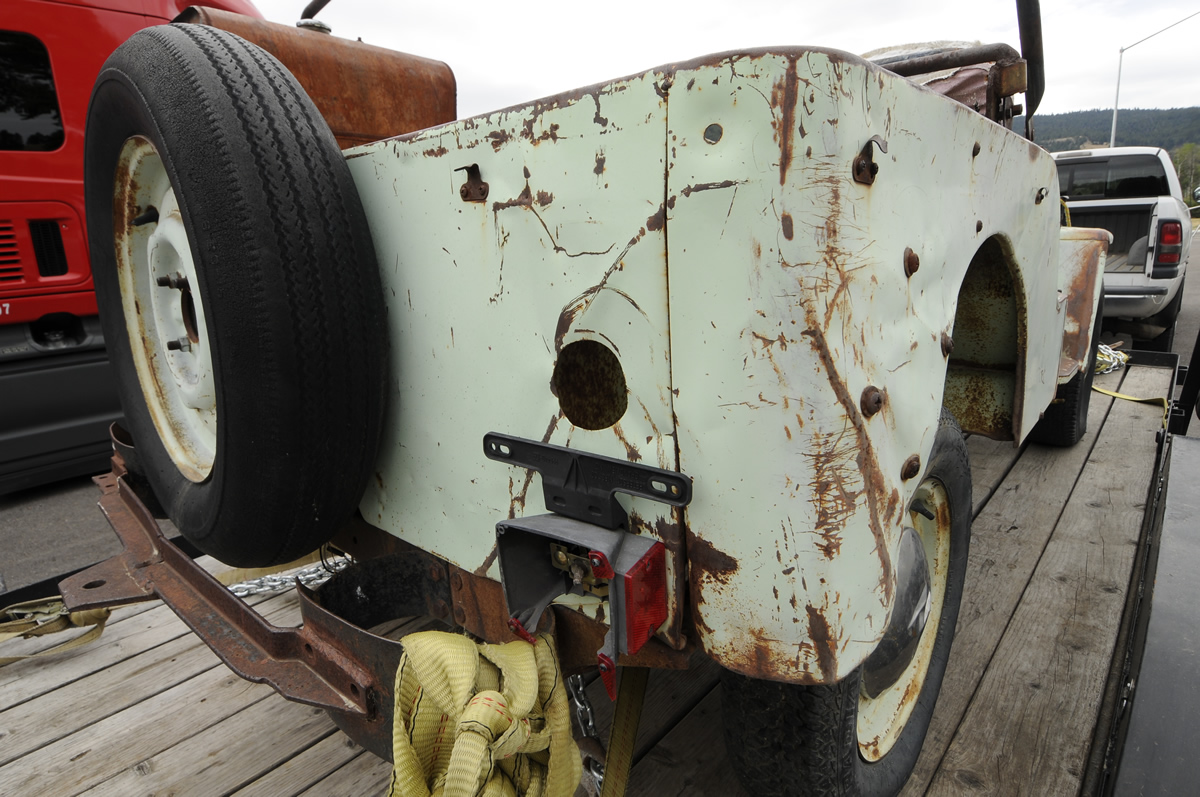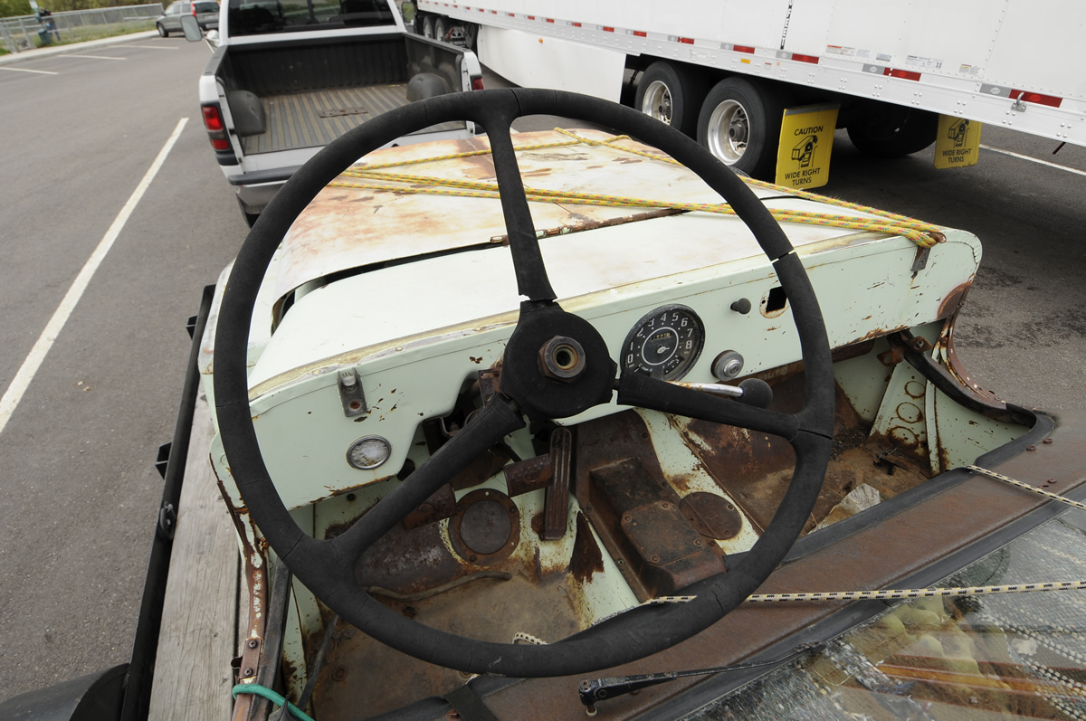 Rusty was owned and driven (apparently very roughly) on a farm near Billings, Montana. There are numerous welds, necessary to fix the cracks that appeared. The hubcaps have all kinds of dents, as does the body, the grille, hood, and the fenders. No part seemed spared. According to Lloyd, the man we bought it from, he purchased at an estate sale. The fact was, the farmer who owned it refused to sell it while alive, so Lloyd had to wait until he died. Lloyd was told it ran until it was parked and that it was parked due to the man becoming unable to drive it. At least, that’s the story. Still, the engine spins, the tranny shifts, and the jeep rolls easily.