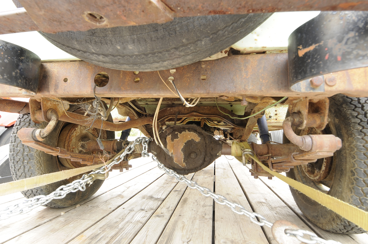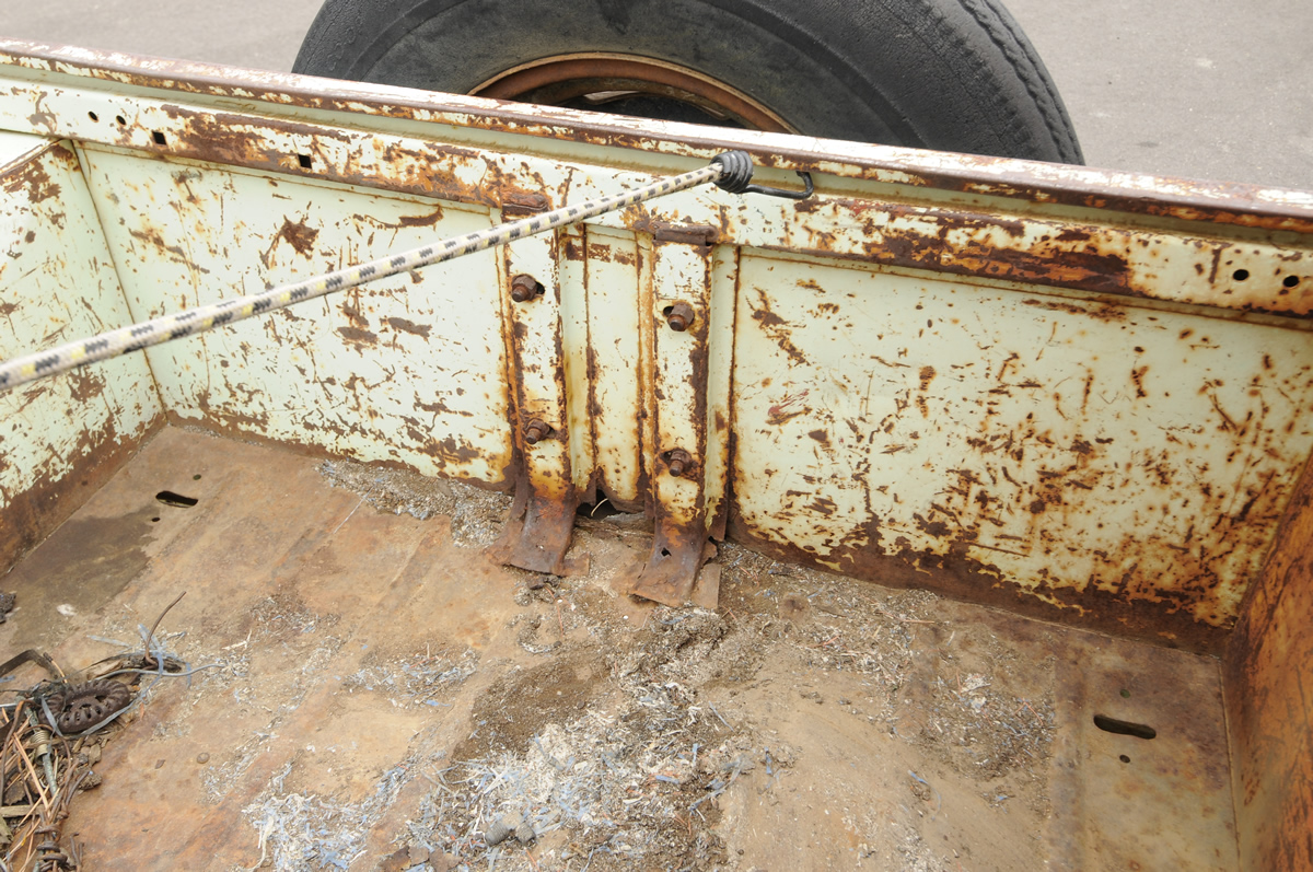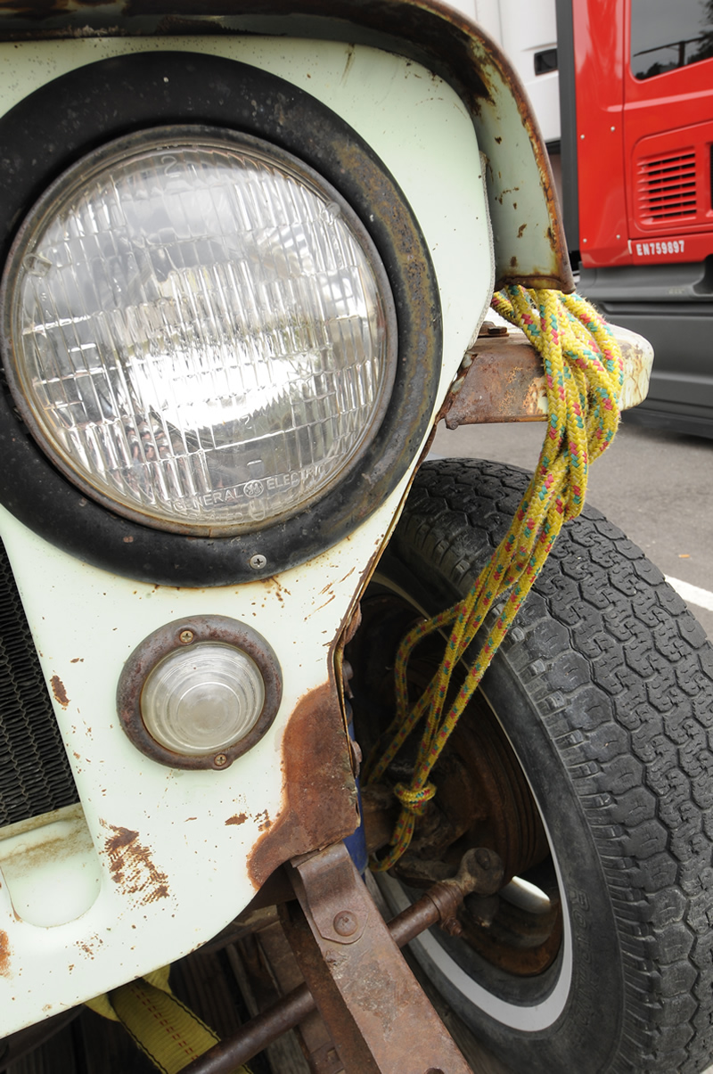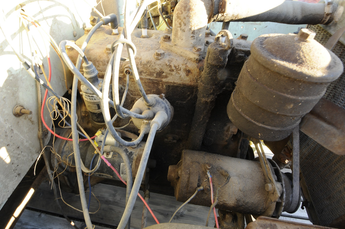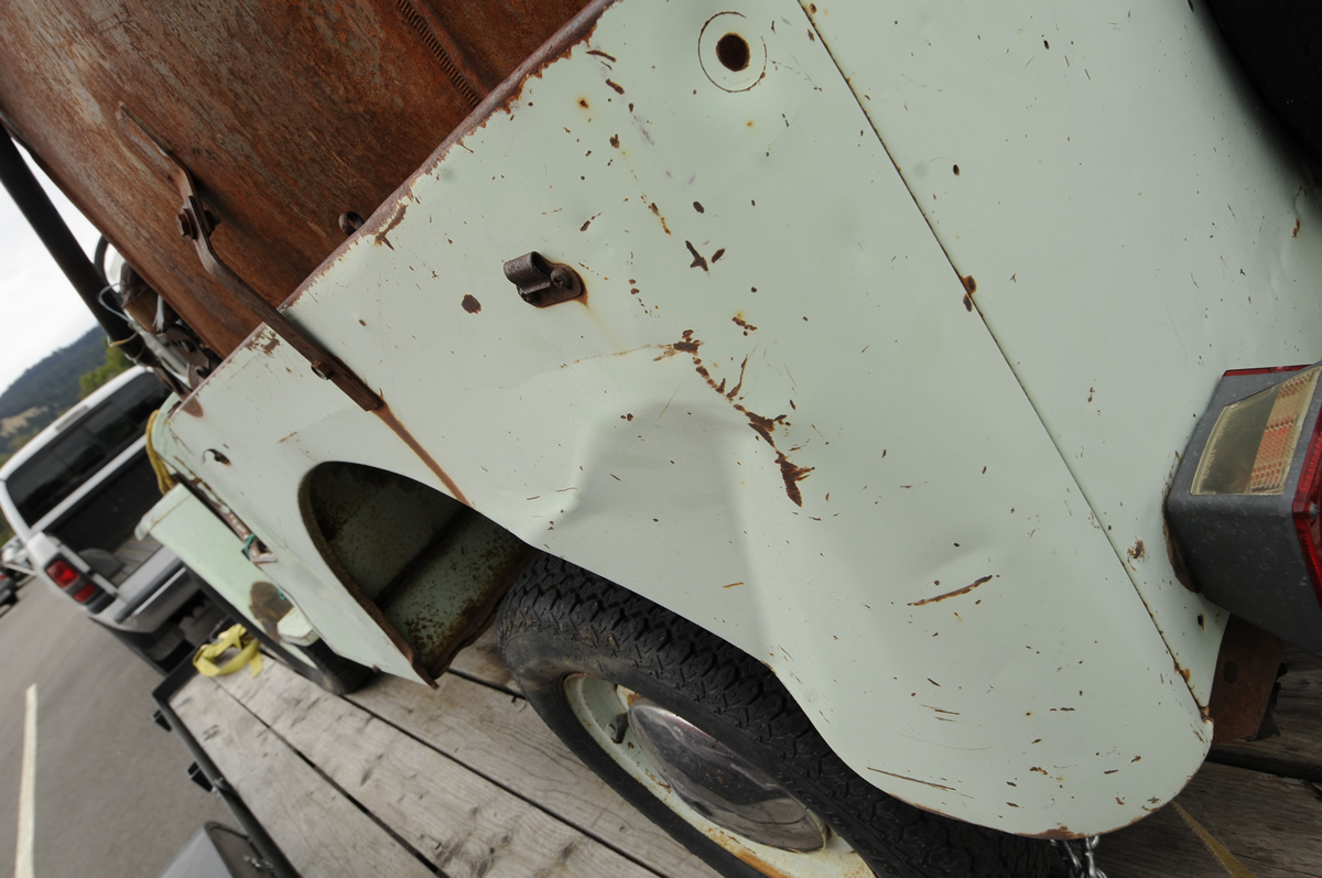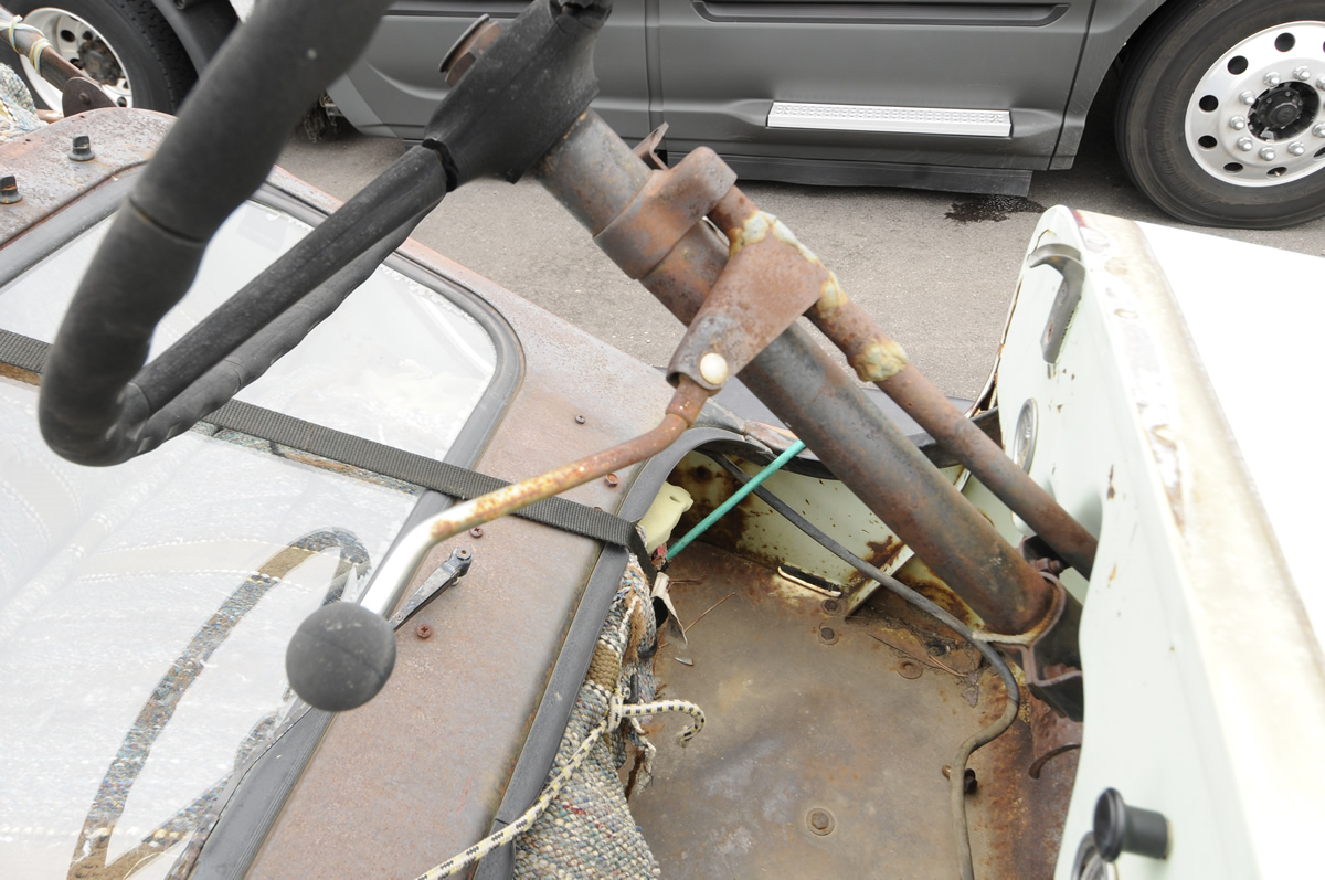 Rusty was owned and driven (apparently very roughly) on a farm near Billings, Montana. There are numerous welds, necessary to fix the cracks that appeared. The hubcaps have all kinds of dents, as does the body, the grille, hood, and the fenders. No part seemed spared. According to Lloyd, the man we bought it from, he purchased at an estate sale. The fact was, the farmer who owned it refused to sell it while alive, so Lloyd had to wait until he died. Lloyd was told it ran until it was parked and that it was parked due to the man becoming unable to drive it. At least, that’s the story. Still, the engine spins, the tranny shifts, and the jeep rolls easily.