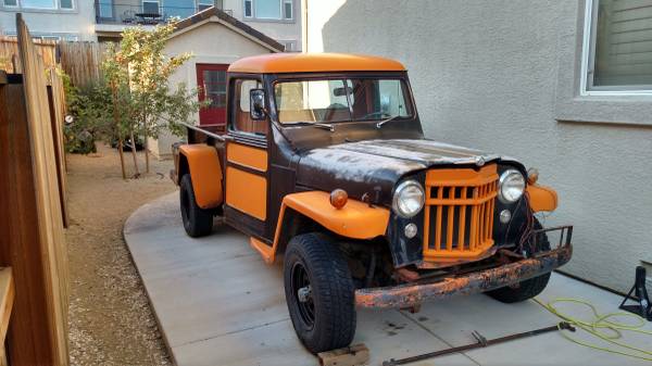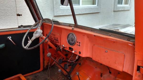“1956 Jeep Truck – The truck has the 6 cylinder hurricane motor that runs. It has a 6 volt system, but the truck needs to have the electrical system re-wired. The bench seat has been re-done and I have a title for the truck. ”
