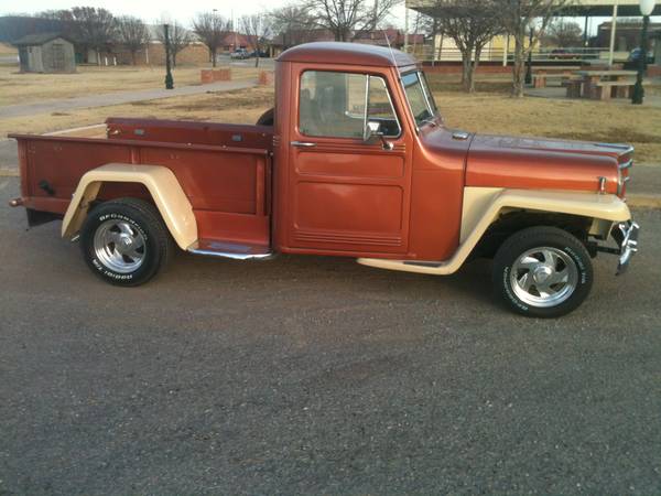 “1950 Willys Pickup it is an older restore. Has a 4.3 tbi with a 700r4 has a camaro front end, heat and air work. (air may need charged) NO Rust Paint does have some chips in it. I bought it about 4 years ago. Fun to drive, but need something that can hold 4 people. possible trade for square body chevy pickup.”