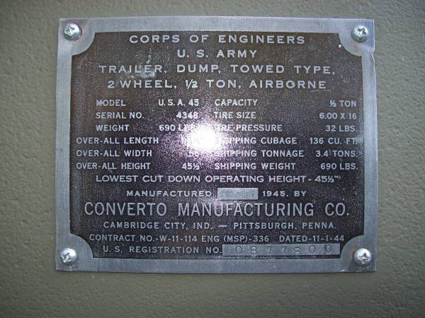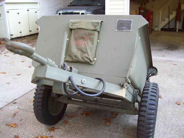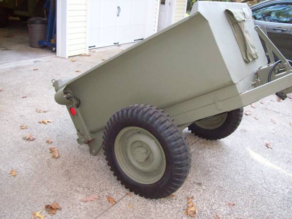 “I have for sale a restored 1945 army jeep trailer.It is a converto dump trailer that has been completely taken apart and rebuilt.It has new wheel bearings new tires and a new original wire harness.The body has been sand blasted and repainted with original WWII OD color.The dump mecanism works fine and the trailer tows good.There is absolutely no body filler in the trailer.All the metal is sound.This is a real nice,hard to find trailer for your willys mb or ford gpw.Has a good and current registration. ”
