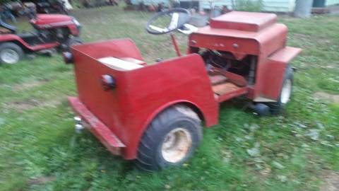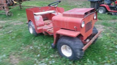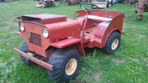 “This is a really hard to find Struck Mini Beep. These were built by the Struck company that is famous for making the little bulldozers that you could buy as a kit. Today they are called Magna Tracks. This one has been modified some. It is a really neat little Jeep. It articulates in the middle to turn. It is four wheel drive. It runs good but could use a couple of new belts. I collect old garden tractors and so it does not really fit so I am passing it on to someone else to enjoy it. ”