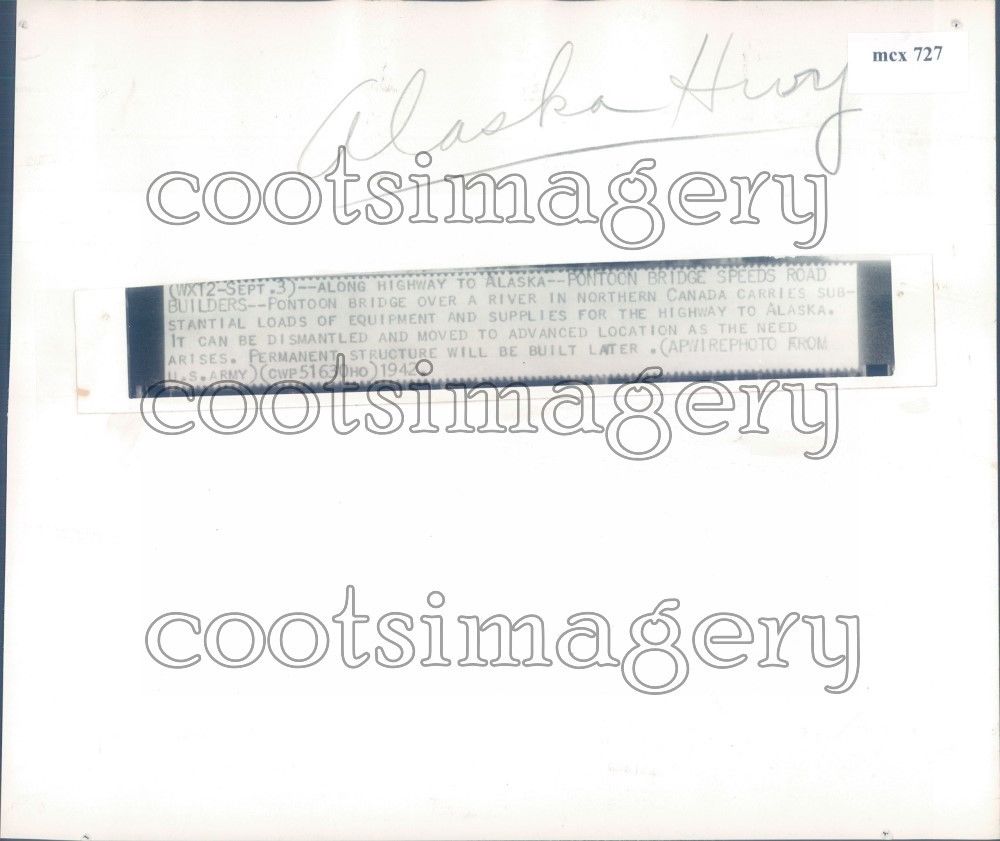 “You are bidding on an original press photo of Truck & Jeep Cross Pontoon Bridge Alaska Highway Construction. Photo has some waving due to too much glue being used to attach the information sheet onto the back of the photo. If the photo in the listing shows any thin green, red, yellow and/or blue lines, they are the result of a bad scan & the lines are NOT on the actual photo. Photo measures 7 x 8 inches and is dated 9/3/1942.”