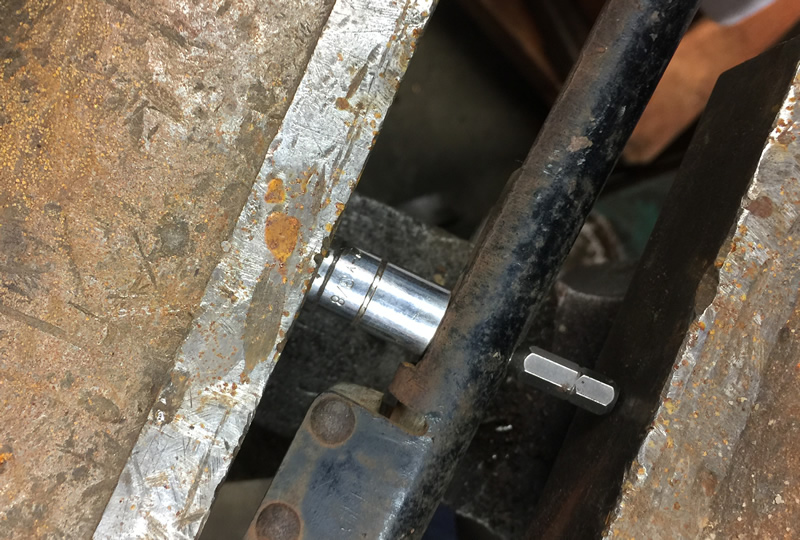 I grabbed a small socket to catch the pin and an object that could press through the hole:parking-brake-rusty4