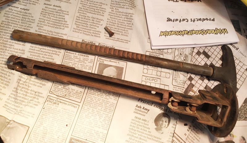 We made it to Seattle a couple days ago. I made some more progress blasting some smaller parts yesterday. In order to blast the t-handle parking brake, I had to disassemble it. The last thing to remove was a screw/pin so I could remove the brake lever from its housing. I didn’t know whether to unscrew or press out the screw/pin, but as I examined iI felt pretty sure it should press out. Still, I thought it best to text a friend: Chris McKay.  He said he thought it was pressed out, too. So, I set out to remove the pin.