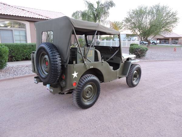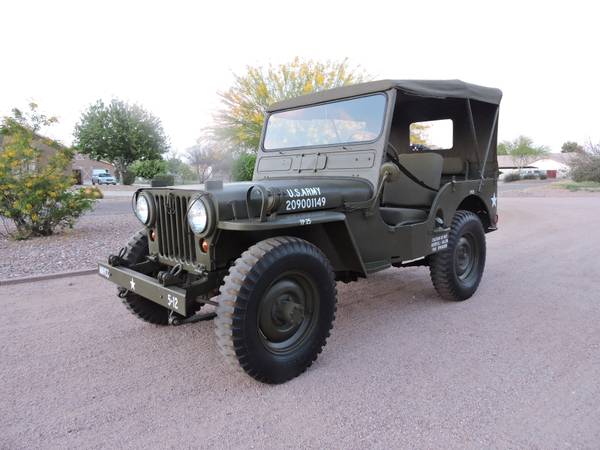 “For sale is an Arizona Willy’s Jeep 1947 CJ2A – M38 Military style restoration with an original M38 go devil engine with serial no. MC96761. This Jeep is Parade ready and Display ready and it was also displayed at the last Military Vehicle Show in Falcon Field in Mesa, Az. It has been converted to 12 volts with a one wire alternator. It also has an original hood and headlight buckets. It has a brand new top and front and rear seats made by Wee Bee Webbing. This Jeep also has a brand new paint from Army Jeep Parts. All the gauges work and speedometer has also been calibrated. I am asking $11,500.00 OBO. ”