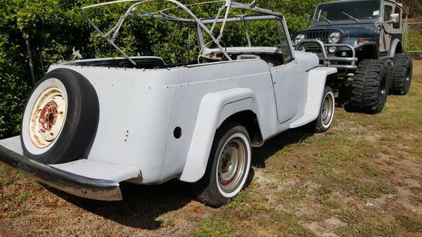 “1948 willys jeepster very clean body and frame very little rust ,would make a good resto mod ,street car or make it a 4×4 ,has no motor or transmission, but is a clean classic car to do something cool with ,if you have the talent and time :)”
