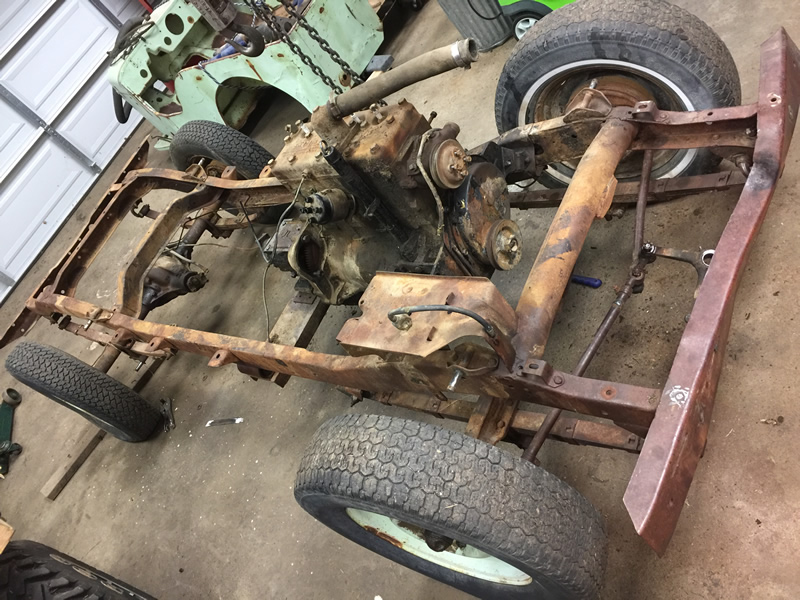 Unlike our sunny Friday, today was a rainy day, so any thought of blasting the frame was put on hold. But, we did get nearly all the parts removed from the frame and the engine/transmission ready to pull out. The more we removed, the more we could see that poor Rusty had come from an abusive home.