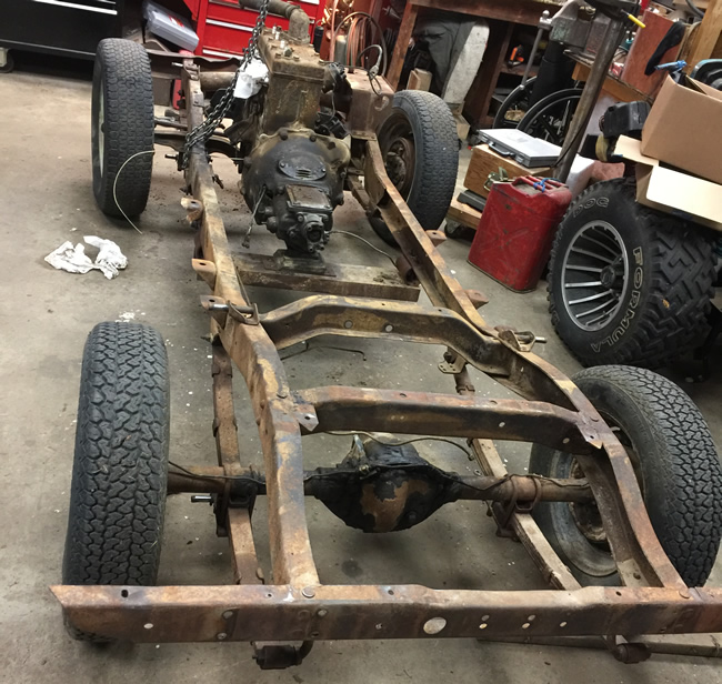 Rusty’s frame is just about ready for some sand blasting. The front bumper rivets have all had their heads ground down, but I still need to punch them through and remove the bumper.