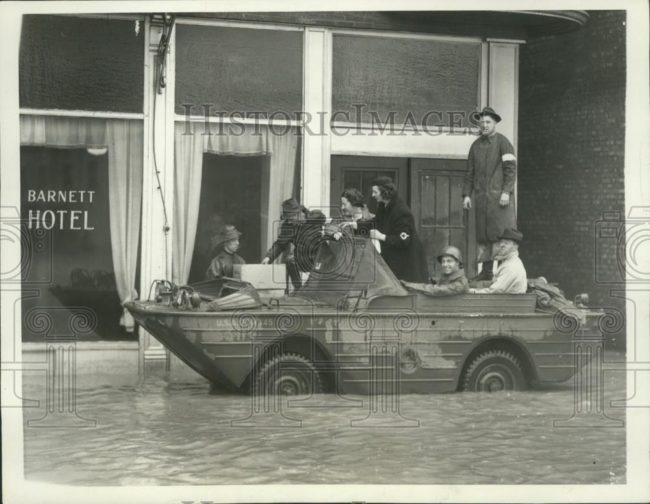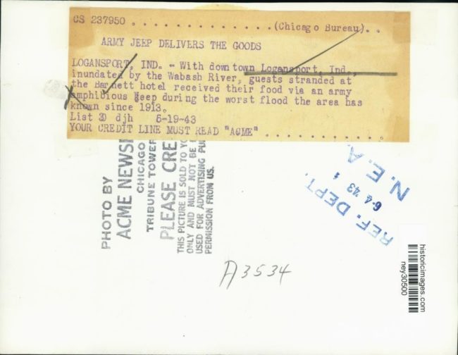 “1943 Press Photo Army amphibious jeep delivers food to flooded hotel. This is an original press photo. With downtown Logansport IN inundated by the Wabash River guests stranded at the Barnett Hotel received their food via an Army amphibious jeep during the worst flood the area has known since 1913. Photo measures 8 x 6.25inches. Photo is dated 06-19-1943.”
