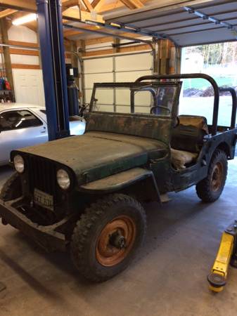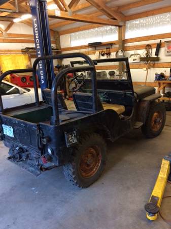 “Early production (or so I am told) CJ2A Jeep, has a power take off (PTO) on it too! 3 speed stick, 4 wheel drive hi/low range. It runs! It drives! It stops! That is about it though… It carries heavy “patina” on the body/tub which is to say it is very rusty-you can see the ground through the floor… Could be the basis for some sort of crawler project. Certainly could be restored as it appears that any part you want is available either used or new /reproduction, even complete bodies can be had. Depends on how much money you want to spend. I have done the following: new soft brake lines, new master cylinder, new wheel cylinders, new radiator hoses, thermostat, radiator cap, spark plug wires. It is not street legal at this time primarily because none of the lights work. With some brake lights and new tires you could drive it as it is I think. If you want something to bomb around on your own property you wouldn’t have to do a thing. One should not think about trying to drive it home in it’s current state, should be trailered. Comes with two extra sets of axles/differentials and a set of extra leaf springs too. I have the original selectmatic locking hubs and it has vintage Warn locking hubs on it now.’