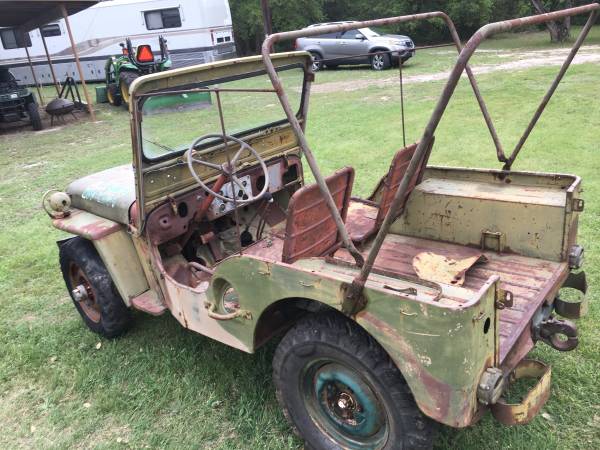 Missing: Oil bath air filter, fuel tank, military light switch housing on dash, rear seat, glove box lid, glove box insert, tail gate, tailgate hinges, drop chains and hardware for the tailgate, and the emergency brake pull handle. This Jeep is otherwise complete in every detail, even has the original top bows and hardware. This is a roller, on original OEM 16″ rims. Shift linkage is free through all gears, high-low range and in-out 4-wheel drive linkage all in excellent original condition.
