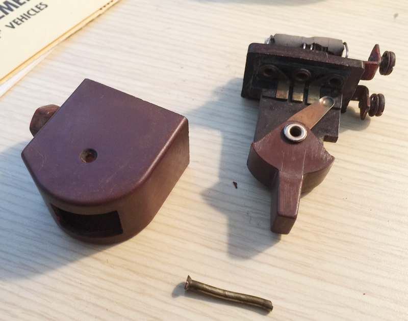 Now, here’s my switch. It received some paint when Patterson was repainted (I believe the paint was touched up some at some point). Once I drilled out the end of the pin a little, I used the nail to push the pin through.