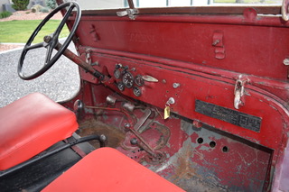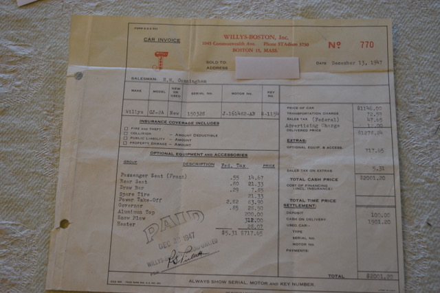 “It is partially restored (Brakes, Suspension, Seats Re-upolstered), 33,618 original miles. My Dad bought it brand new Dec. 13, 1947 and I have the original bill of sale. It starts easily and holds excellent oil pressure, never had the head off but is in need of carb re-build. I have all the original equipment including governor, PTO, all seats and original aluminum removable hard top with exception of the snow plow. I also have a wide array of spare parts including color-coded cloth wireing harness, vacuum and electric WW motors, ignition parts, complete exhaust system, etc, everything that one would need to put it into first order condition. But it needs to go to a legitimate restorer who can do it right. The engine & VIN numbers on the Bill of Sale match the Jeep and data tags.