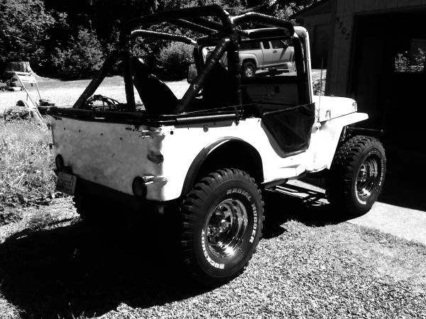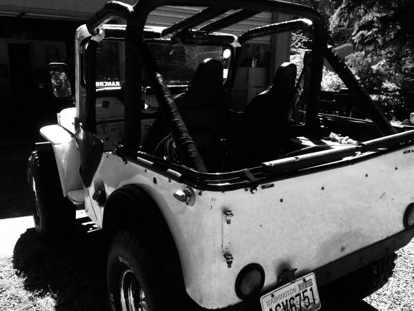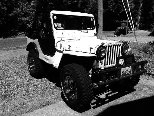 “51 Willys Jeep Flat Fender, 327ci, Dana 30’s front and rear, 3 speed, newer soft top, bikini top, half doors, spare tire/Jerry can rack,