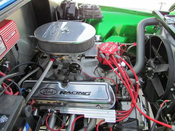 “This 1952 Willys has had several modifications, namely a reconfigured floor pan and cowl to accommodate the late-model Ford 302 small block V-8 and C-4 automatic transmission. Other modifications include power rack and pinion steering, power front disc brakes and chassis upgrades to accommodate the 33 inch Goodyear Wrangler tires on custom alloy rims. The engine is dressed with Ford Racing Billet accessories, MSD ignition, 4 barrel carburetor and ceramic coated headers and dual exhausts with chrome side pipes