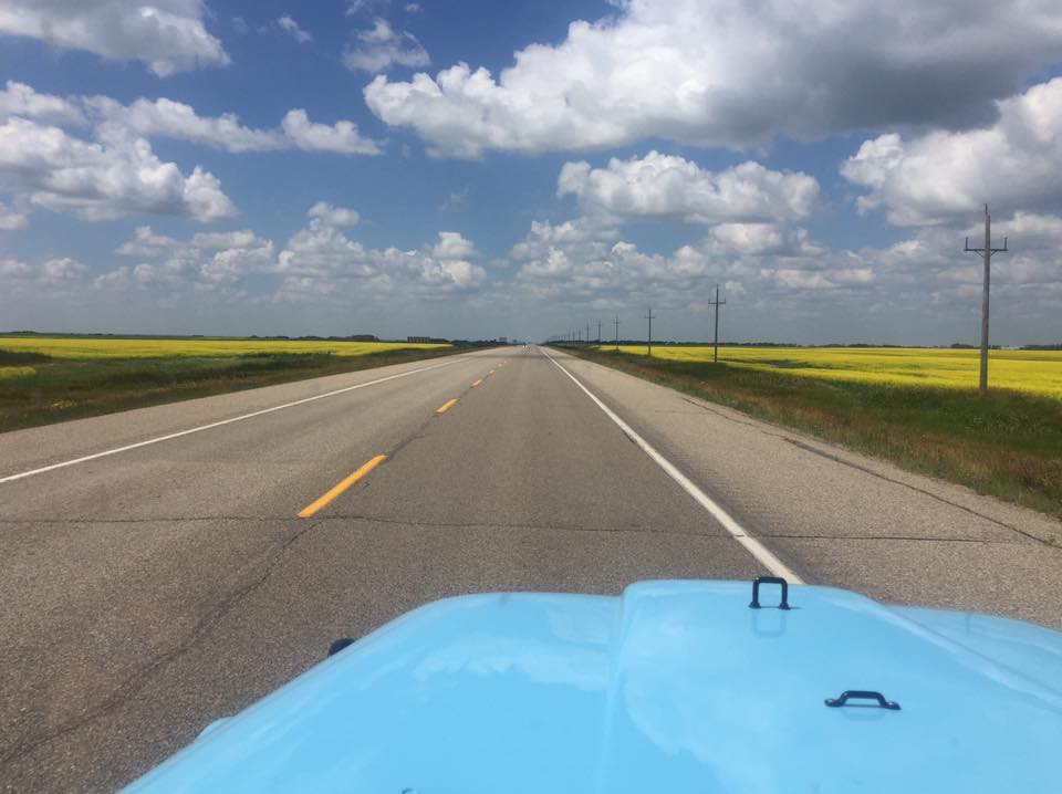 4. Bill and Jim continue to pass through the flat lands of central Canada. They’re glamping tonight with the big busses and campers. He thinks Kevin might cut down one of the trees to make a fire!
