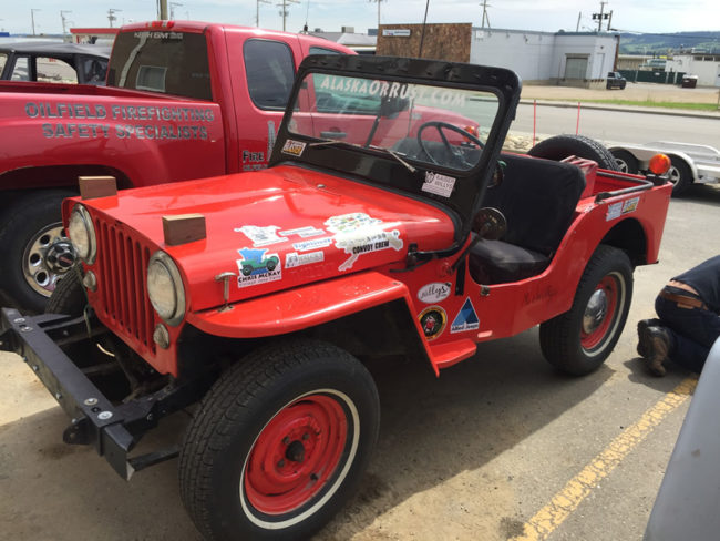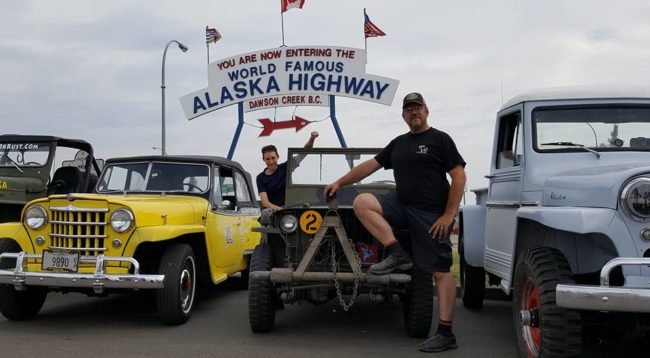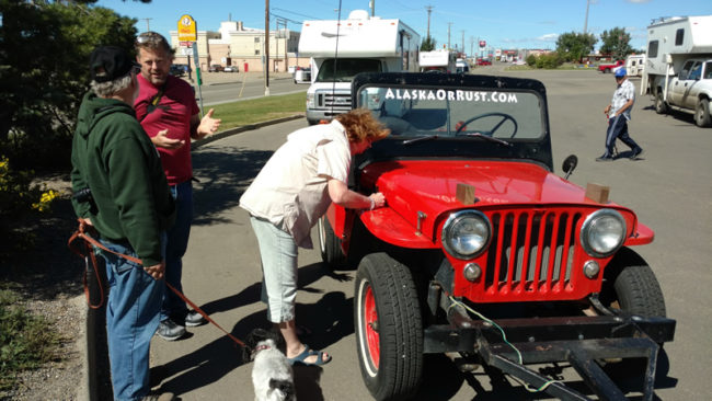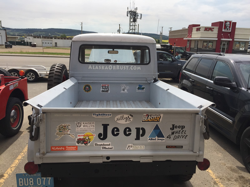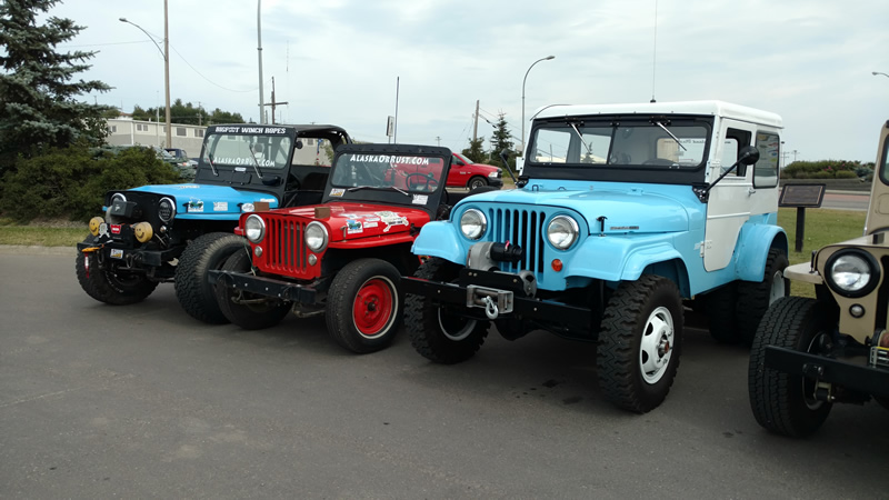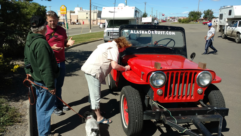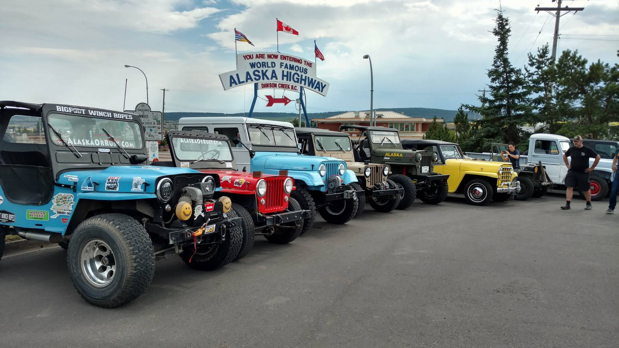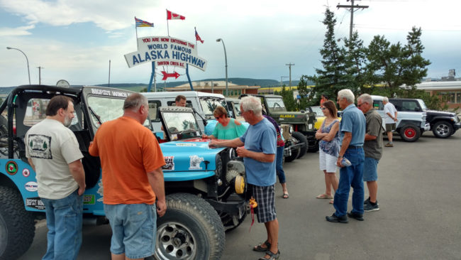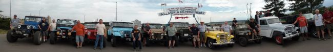 After we adjourned, most of us spent the afternoon fixing jeeps and running errands. At 3:30pm, we all gathered again and drove to Alaska Highway sign for group pics. Once we lined up the jeeps, a small crowd started to form. We asked them to come over and sign Patterson’s or Rob’s hood.