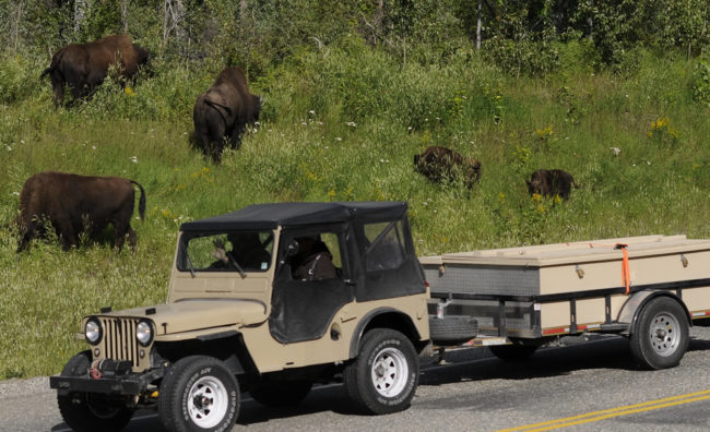 There were several more herds of bison that we passed, all lazily hanging out in the grass on the sides of the road. From the hoof prints on the side of the road, it’s clear the bison used the road as much as humans.